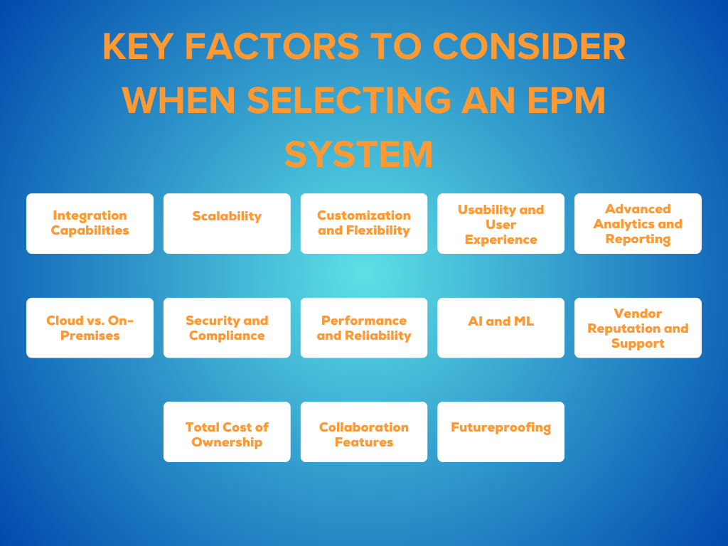 Choosing the right Enterprise Performance Management (EPM) solution is crucial for the effective management of an organization’s financial planning, budgeting, forecasting, and reporting processes. Here are key factors to consider when selecting an EPM system:
